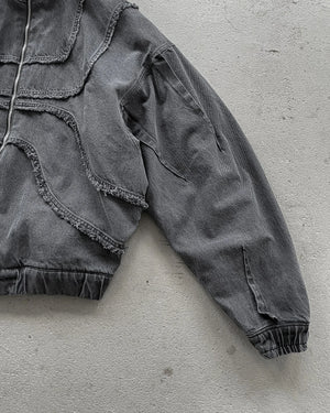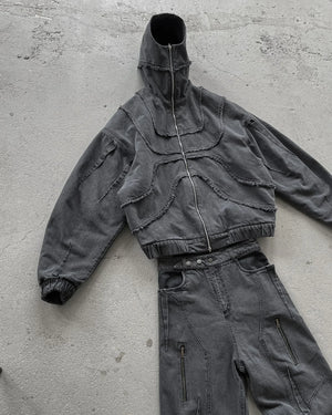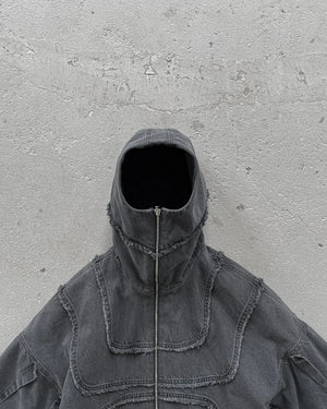 this hoodie has a unique design with a high neck that can be zipped up to cover the face, resembling a hood. The hoodie features decorative stitching and paneling that gives it an armored appearance. It also has a front zipper closure and a vintage wash, giving it a worn, retro look. Zip-up hoodies like this have become popular again